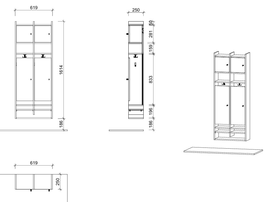 • wandhängende Spindgarderobe mit 2 Plätzen