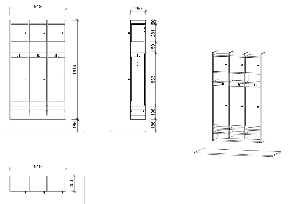 • wandhängende Spindgarderobe mit 3 Plätzen