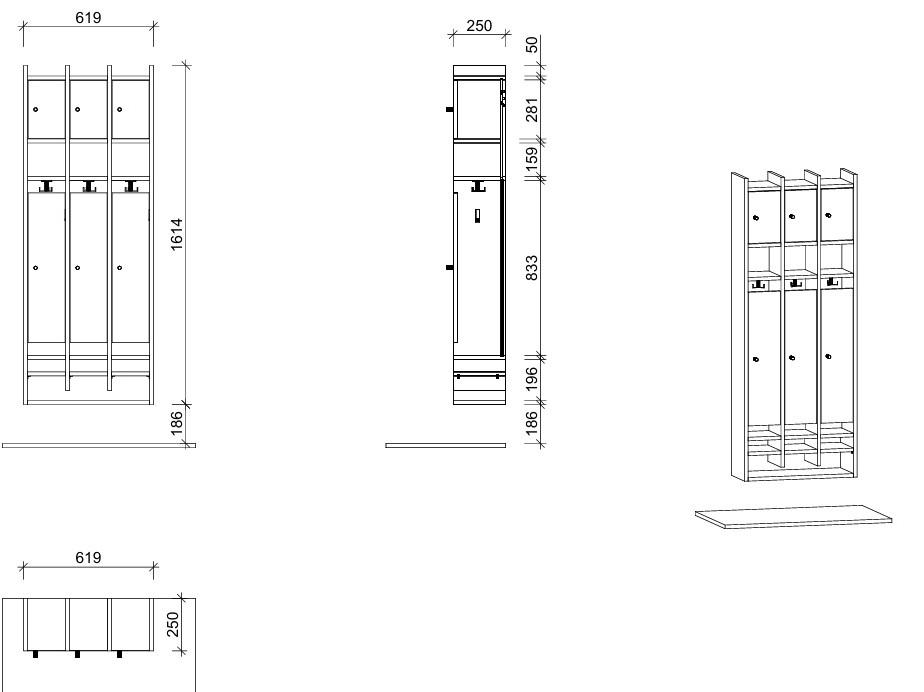 • wandhängende Spindgarderobe mit 3 Plätzen