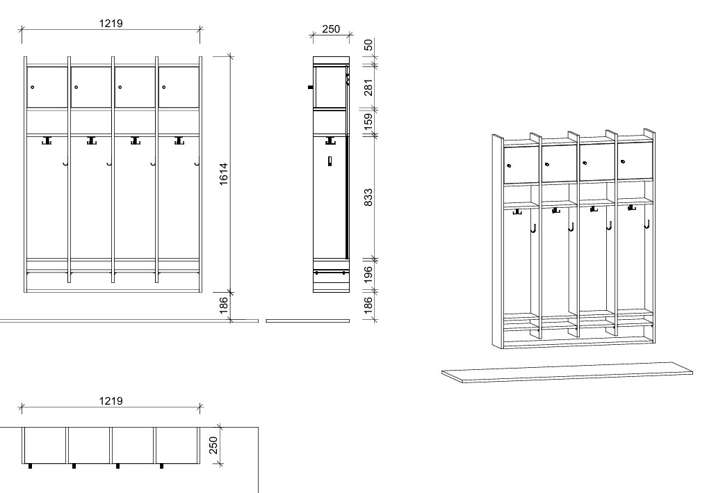 • wandhängende Spindgarderobe mit 4 Plätzen