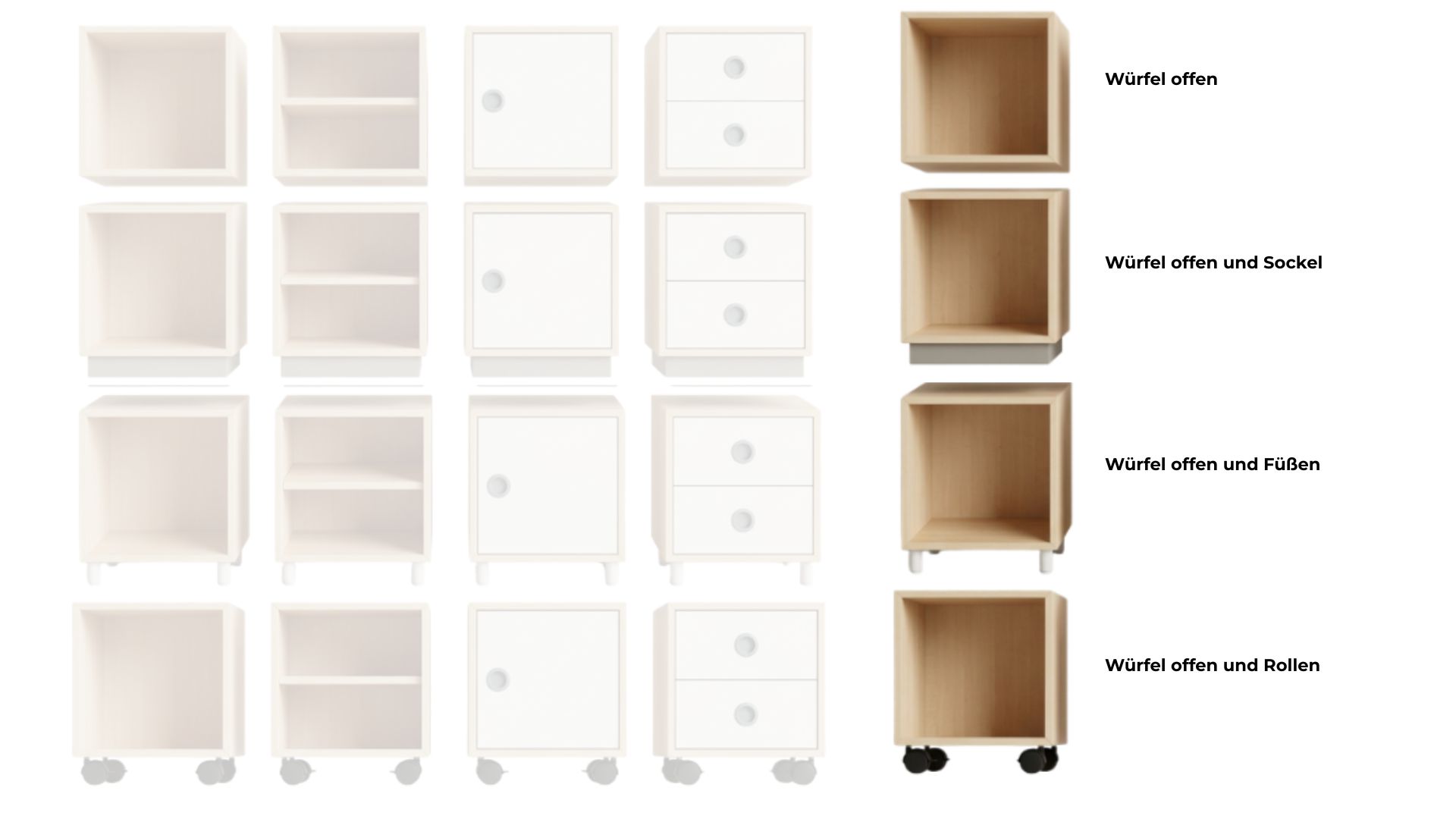 Ob einzeln als kompakter Würfel, fahrbar als Hocker, in Reihe gestellt oder als komplette Schrankwand – das System wächst mit und ermöglicht individuelle Lösungen für jede Raumsituation.